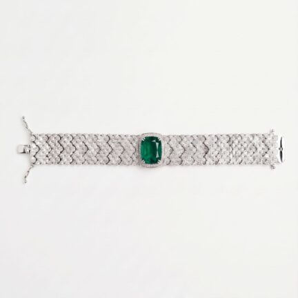 Adjustable emerald green ring in platinum finish lined with cz