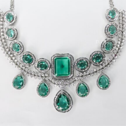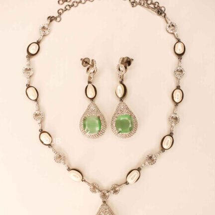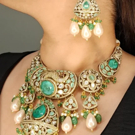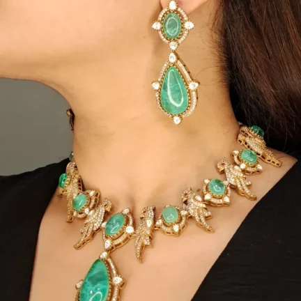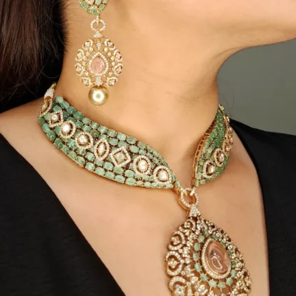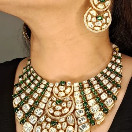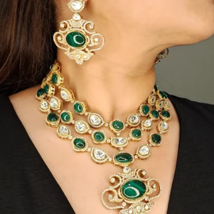 Moissanite Polki Fusion Necklace Set with Emerald Green Stones