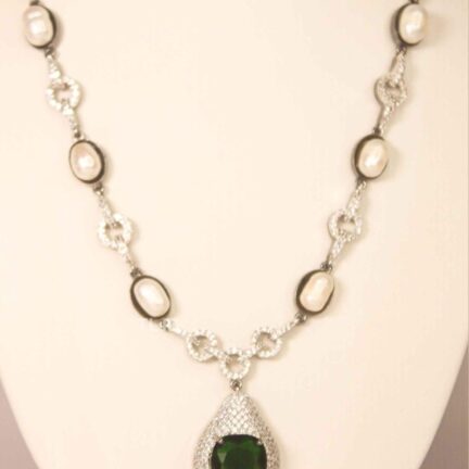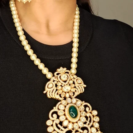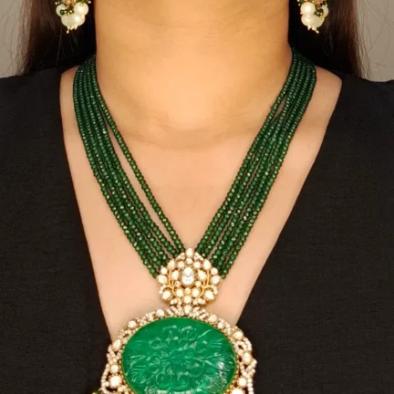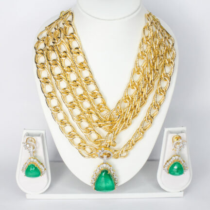 Triple Line Long Length Necklace Set with Emerald Green Stones