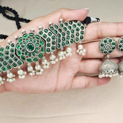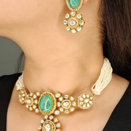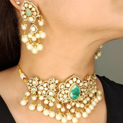 Moissanite Polki Fusion Choker Set with Emerald Green Stones