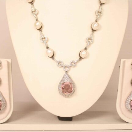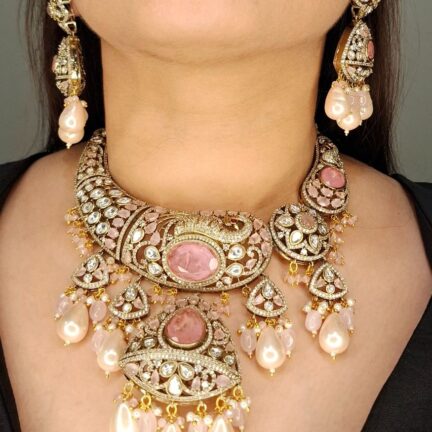 Moissanite Polki Fusion Kundan Set – Pink Topaz & Pearls