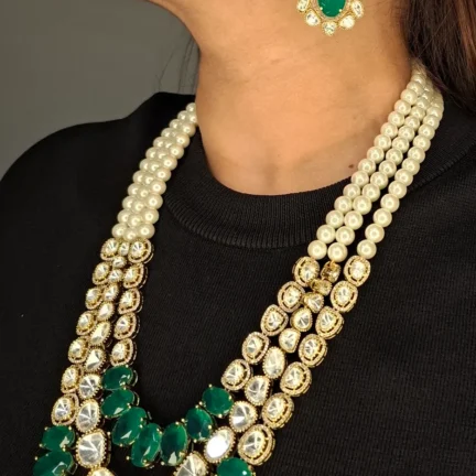 Triple Line Moissanite Polki – Green Kundan & Pearls