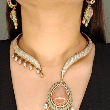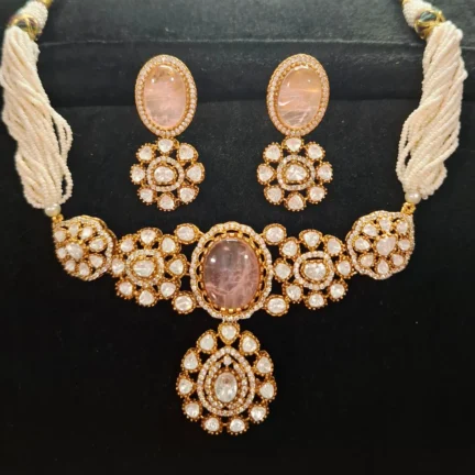Moissanite Polki Fusion Choker Set with Rose Quartz Stones