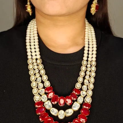 Triple Line Long Length Necklace Set with Ruby Red Stones