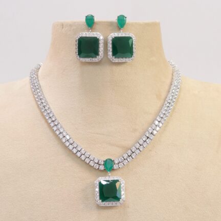 Platinum plated necklace set with fancy cut cz and emerald green stones