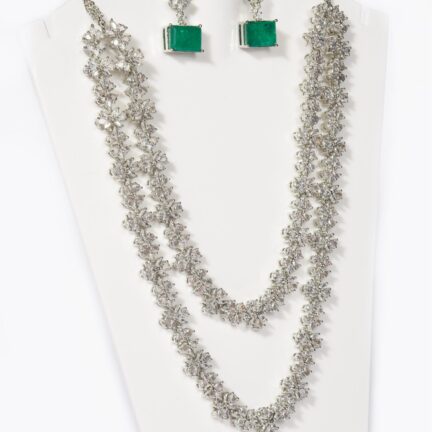 Two layered platinum cz necklace set with emerald green stones