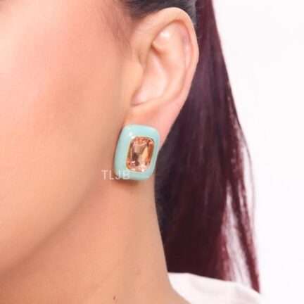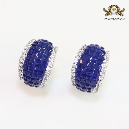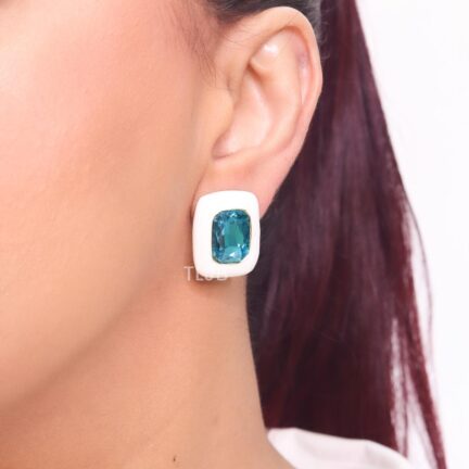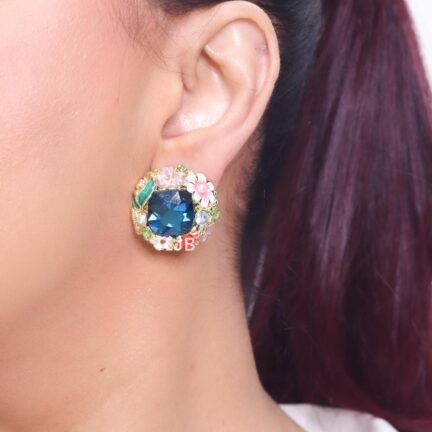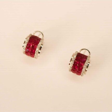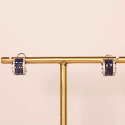 Gold plated studs with rectangular blue sapphire cubic zirconia stone and baguette ruby cubic zirconia stones on sides
